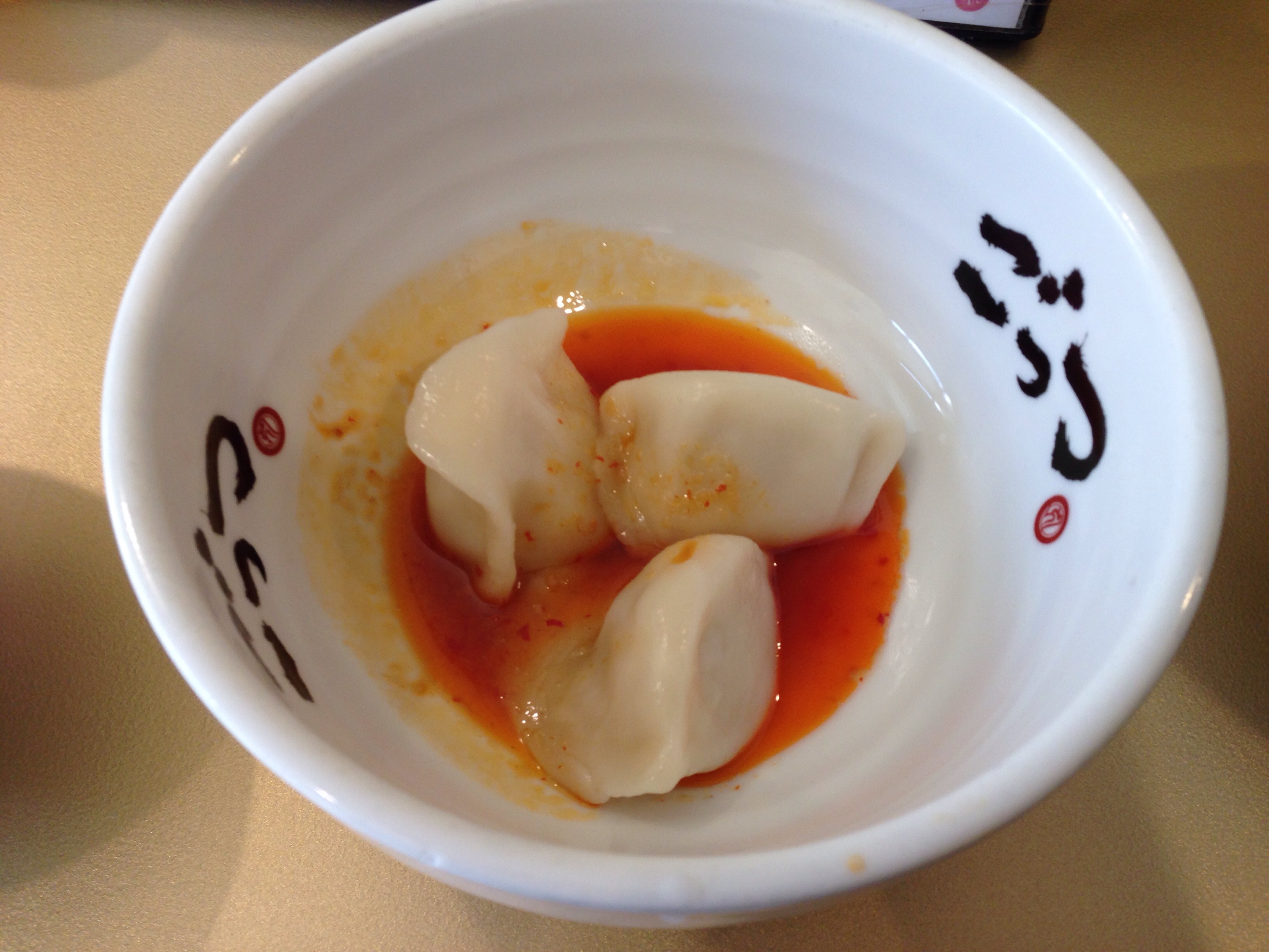 平日の昼間はこの皮がモチモチの水餃子3個と半ライス、そして麺を中盛り、大盛りしても750円だと言うのだからコスパはかなりのものがある。