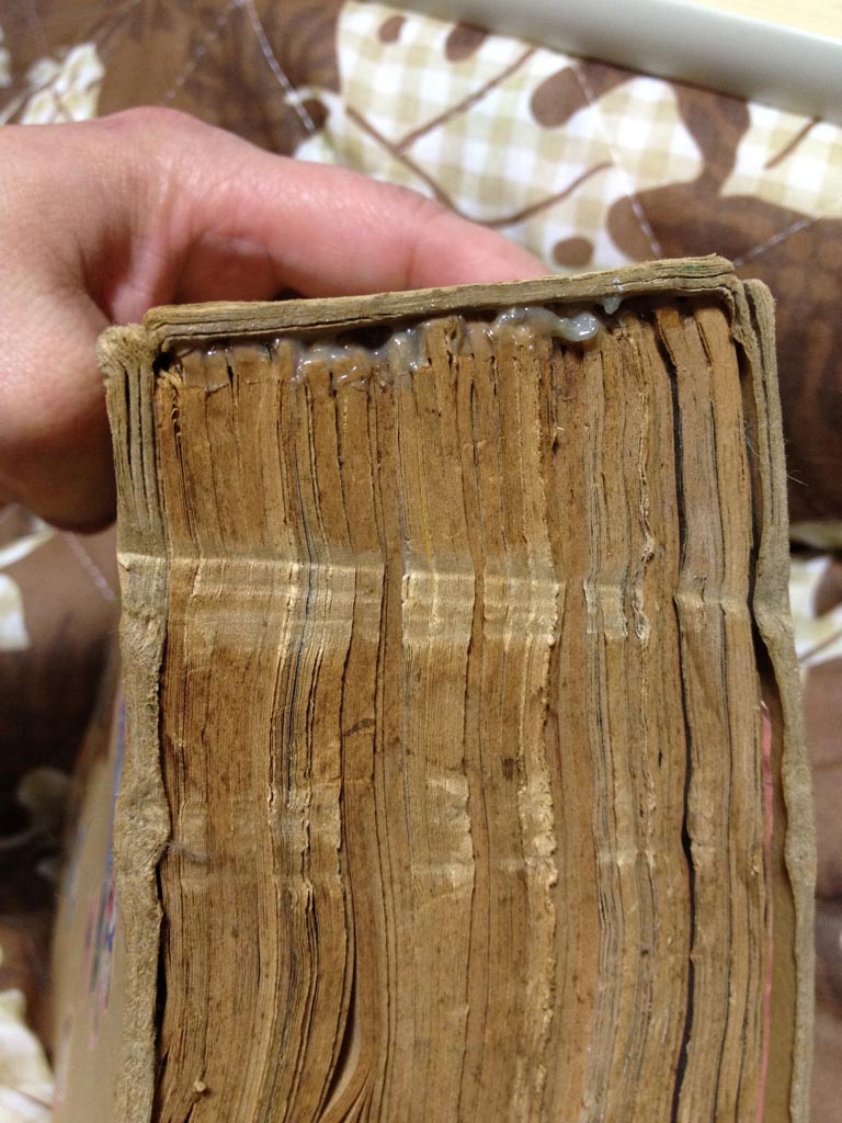 漫画を切り離したあと、無地の厚紙を表紙にして、漫画を木工用ボンド(酢酸ビニルエマルジョン系接着剤)で固めた。