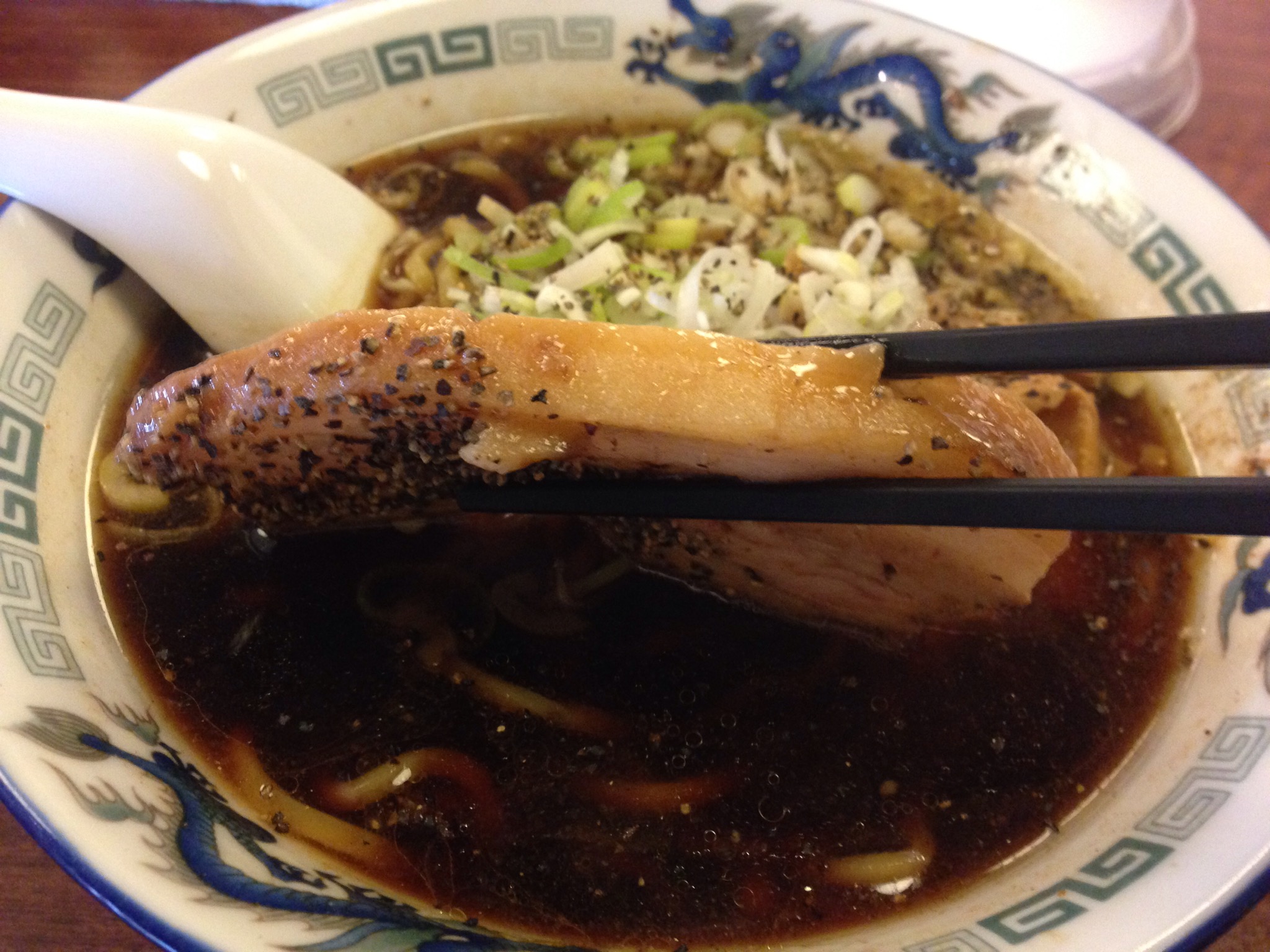 まずこの真っ黒いスープをどんぶりを両手で持ってずずっと飲みます。