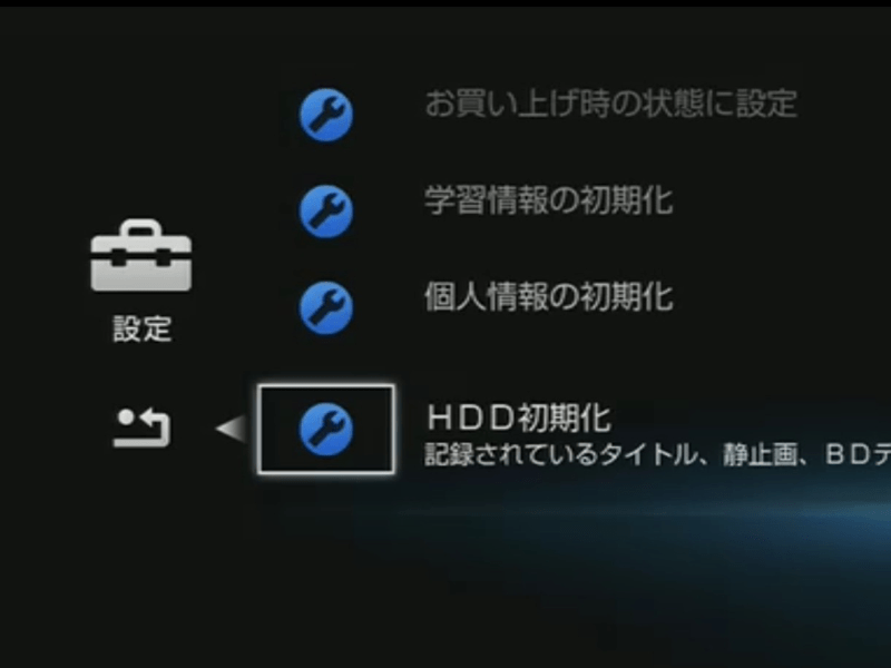 ドライブを交換後、設定の中にある設定初期化項目からHDD初期化を選び実行しました。