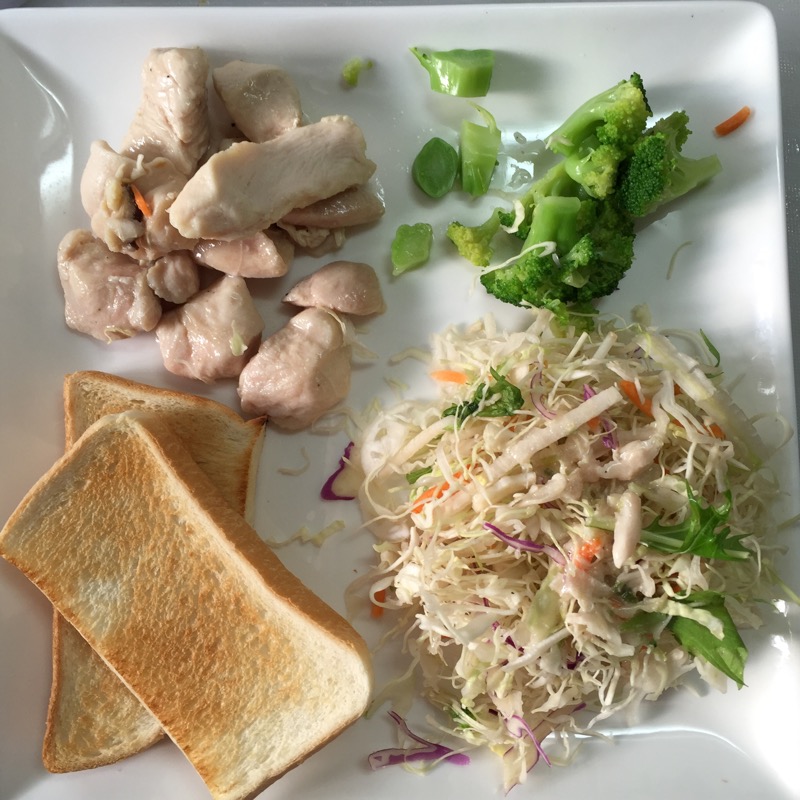 本日の宣教師プレートはトースト、サラダチキン、ブロッコリーとキャベツサラダで約252kcal。